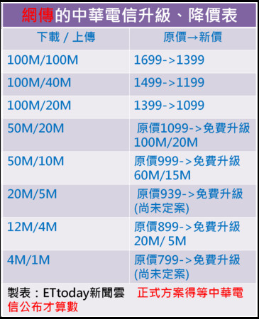 ▼網路上流傳的中華電信升級、降價表(圖/ETtoday東森新聞雲製表)