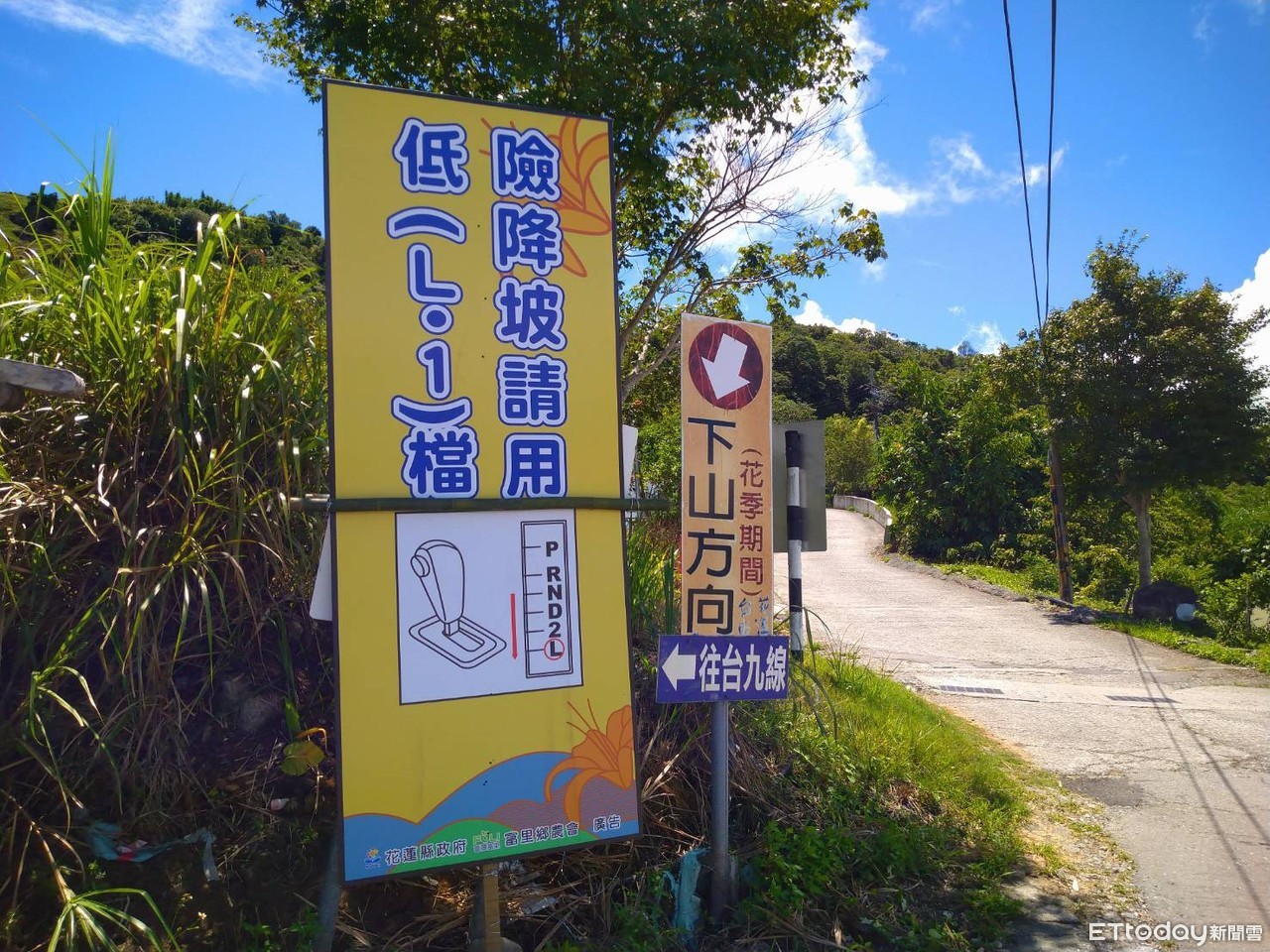 ▲賞金針花山路陡峭,特別製作3公尺大警示牌提醒駕駛人減速的行。