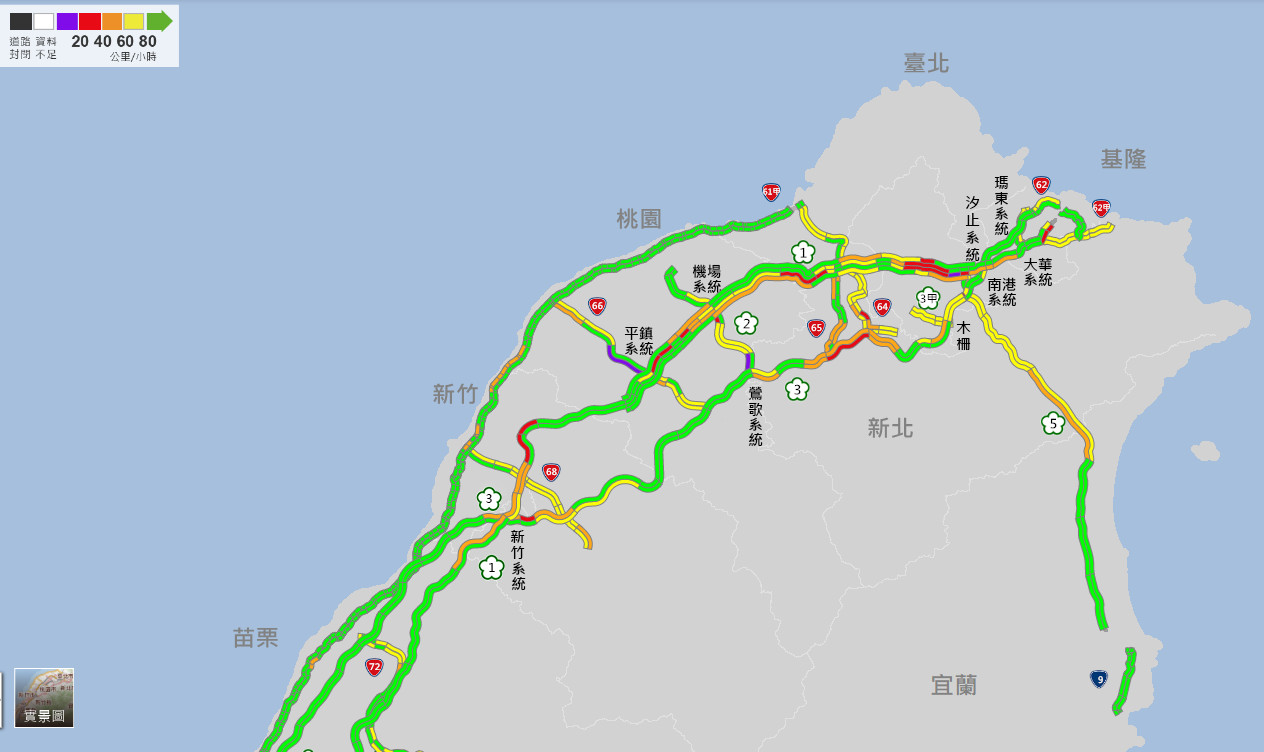 中秋連假前夕,西部國道30日下午3點湧現車潮,隨著下班尖峰時段到來,國1、國3多處路段出現壅塞,不僅多處路段呈現紅色,甚至一度出現長長的紫爆,導致車速低於20公里,反觀國5意外順暢。