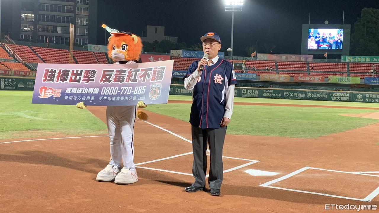 ▲台南地檢署特結合統一7-ELEVEn獅隊,在台南市立棒球場,辦理「強棒出擊‧反毒紅不讓」反毒宣導活動,法務部部長蔡清祥擔任開球嘉賓。(圖/記者林悅翻攝,下同)