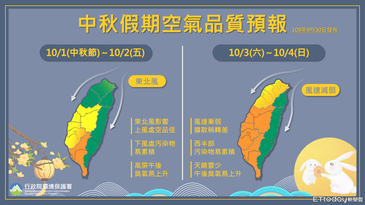 環保署表示,中秋節當天,竹苗以北地區為迎風面,擴散條件較佳,南部地區位於下風處,可能稍有污染累積,午後臭氧濃度偏高,空氣品質可能達橘色提醒等級。