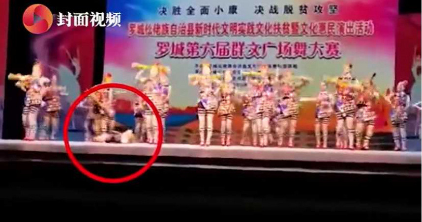 綜合陸媒報導,這起事件發生在上月28日,廣西羅城仫佬族自治縣廣場舞大賽上,從影片中可見,有多名舞者在舞台上表演,但其中一名已退休、年紀較長的女舞者跳到一半時膝蓋突然微彎,接著疑似全身無力就往後仰倒在地上,後方另一名女舞者當場似乎有些愣住了,但也有舞者相當淡定地走位,直接跨過昏厥的舞者繼續跳舞。