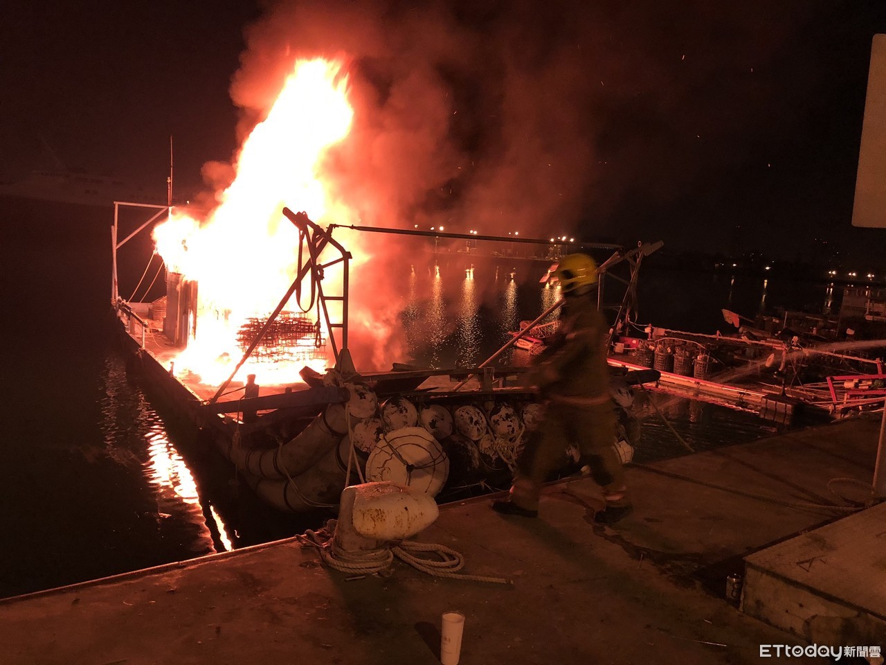 ▲安平區觀夕平台內港碼頭1艘舢舨船,疑似煙火落焰引燃,消防人員全力射水搶救。(圖/記者林悅翻攝,下同)