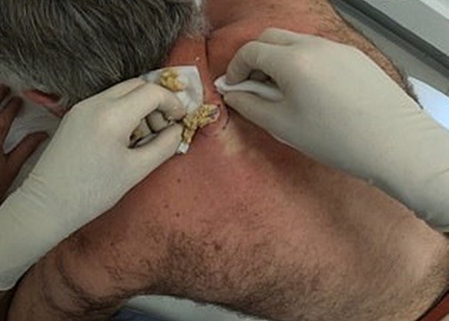 英國一名男子前往診所求醫,為的就是想要移除頸部下方約莫兵乓球大小的10年脂肪瘤,可見醫師在注射局部麻醉後,切開患部,接著兩手拿起紗布用力向中間一擠,黃色黏稠物不斷噴出。