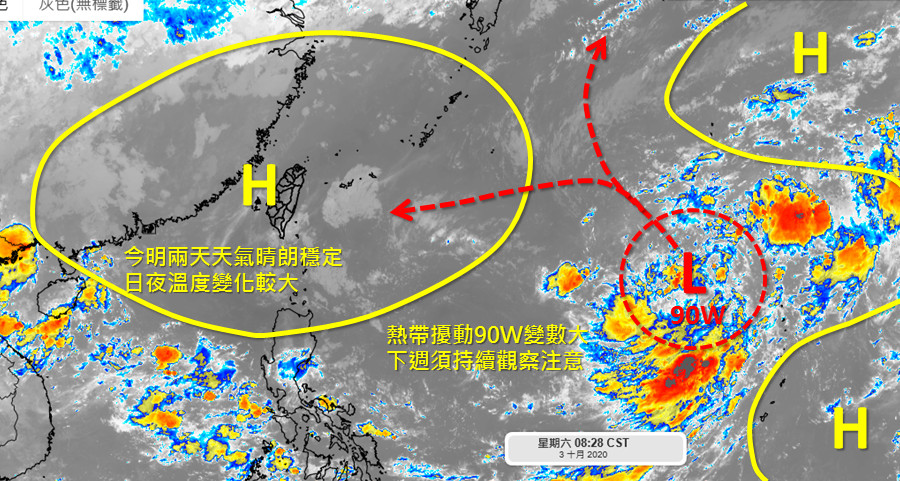 天氣職人吳聖宇表示,今、明兩天各地仍為晴到多雲,因為天氣良好的關係,白天溫度明顯上升,高溫普遍都有30度以上,但是夜晚清晨因為天空無雲,輻射冷卻現象也變得比較明顯,局部地區夜晚清晨低溫稍低一些,有可能降到21到22度,日夜溫差變化較大。