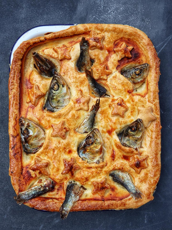 「仰望星空派」(Stargazy pie)是英國的一道傳統菜餚,材料包括沙丁魚、雞蛋、馬鈴薯,烤過的魚身、魚頭突出,看起來在仰望天空,所以才取名為「仰望星空派」,同時有黑暗料理之稱,近日有位日本網友把仰望星空派用巧克力餅乾代替,中間插上多隻小魚乾,鹹甜交雜的風味在推特上引起討論。