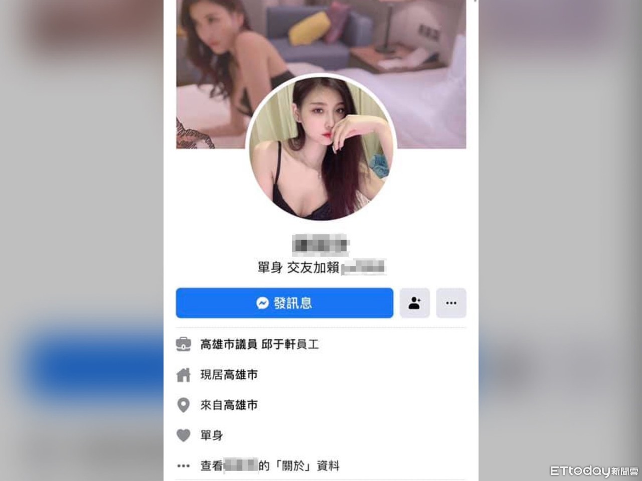 網路上傳出有女子在臉書工作經歷欄上註記「高雄市議員邱于軒員工」,不過大頭貼上卻是穿著清涼、露出凶狠事業線的照片,點開女子的基本資料顯示,居住在高雄市、現年22歲,感情狀況單身,個人簡介更放上LINE ID,讓人不禁懷疑,這真的是「議員助理」嗎?