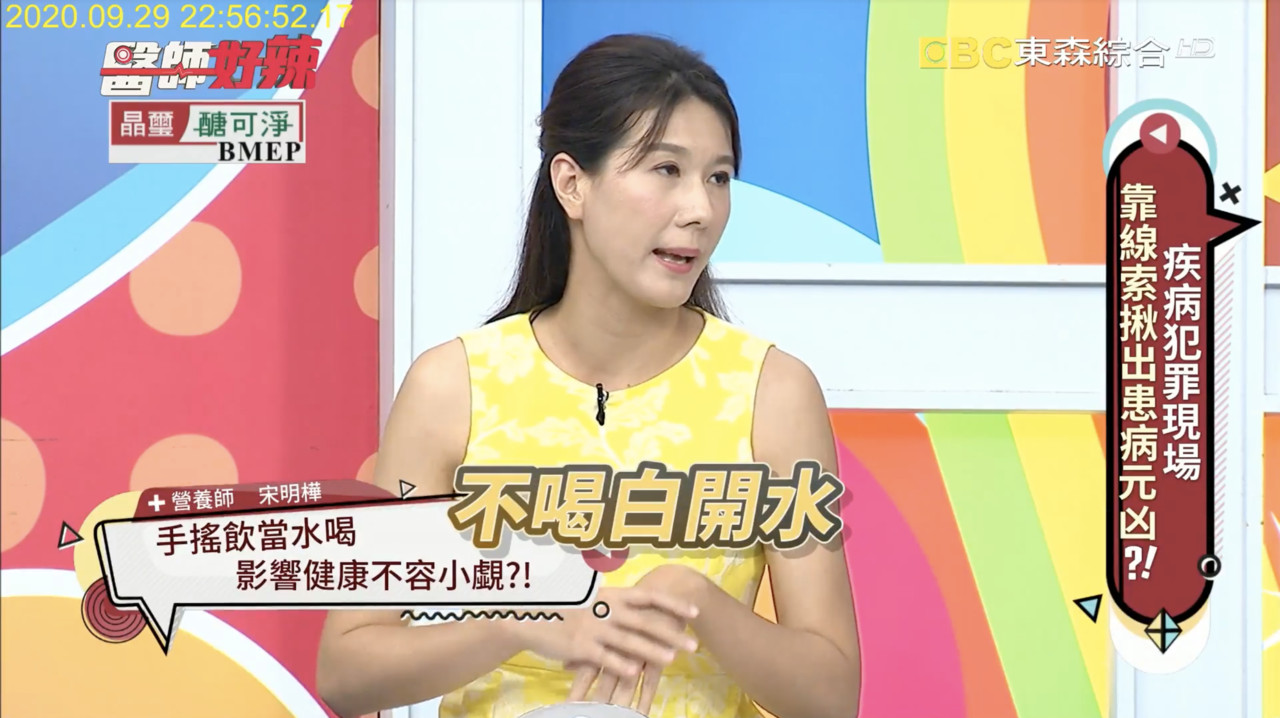 營養師宋明樺聽到何妤玟的分享後指出,現代人很多都不愛喝白開水,她也有位朋友習慣以手搖飲作為日常飲品的選擇,但除了飲料中所含的熱量容易導致肥胖之外,該名友人甚至出現反覆泌尿道感染症狀,宋明樺更表示,朋友因長期飲用高熱量含糖飲料,肌膚狀況也受到影響,經常出現痘痘、粉刺等問題,她也建議朋友如不愛喝無味道的白開水,不妨在水中加一些果乾、酸梅,甚至加一點點蜂蜜,讓白開水不那麼無聊,同時又能避免攝取過多糖分和熱量,如同何妤玟推薦的香檬汁,也是為白開水添味的關鍵。宋明樺更點出一大重點「其實我們還是要喝白開水」,光喝含糖飲料或咖啡等替代白開水絕對是萬萬不可。