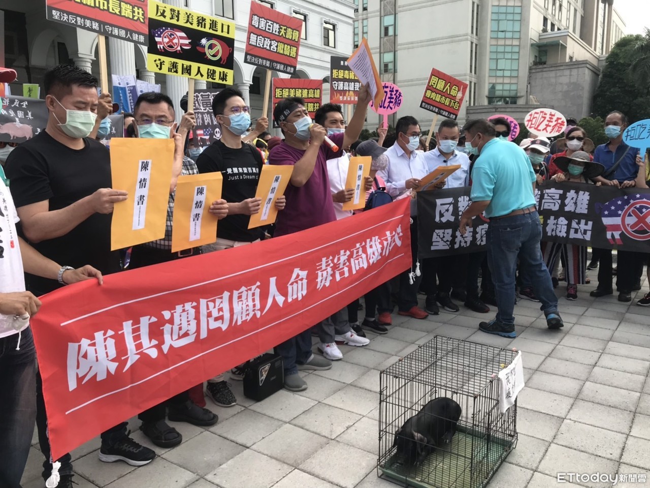 ▲挺韓直播主搬小黑豬到場議會場外反美豬進口。(圖/記者吳世龍攝,下同)