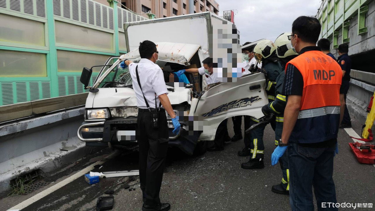 北市建國高架橋下民族東路閘道7日中午發生一起嚴重車禍!現場一輛小貨車與前方貨車發生追撞車禍,巨大撞擊力道導致後方小貨車車頭幾乎被撞毀,駕駛受困車內,意識不清滿身是血趴在方向盤上。警消人員獲報趕抵現場,緊急出動破壞機具將駕駛救出,目前仍在搶救當中,至於詳細車禍原因仍有待調查釐清。