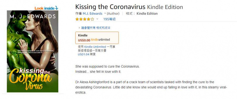 根據《紐約郵報》報導,這名做作愛德華斯(MJ Edwards)的女作家,出版的「情色小說」描述女研究員和新冠病毒之間的「愛情」,這本名為《親吻新冠肺炎》(Kissing the Coronavirus)的情色小說,封面是一名身材火辣的女性和一名宛如「綠色浩克」的男性相擁,小說中的女主角亞莉莎博士(Alexa Ashingtonford)博士,和一群科學家組成團隊,共同研發並找到治癒新冠病毒的方法。