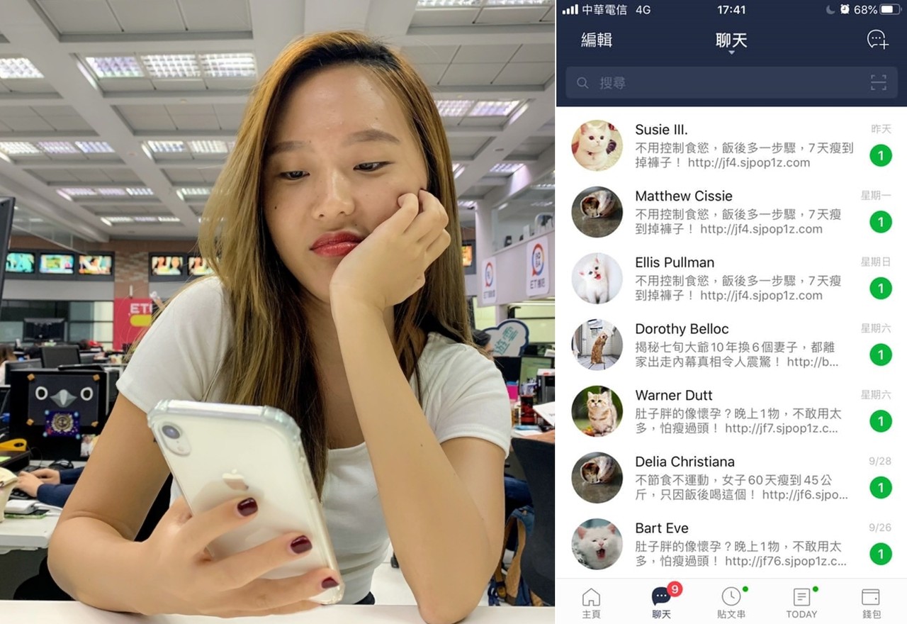 原PO在臉書社團「爆廢公社二館」貼出對話紀錄,幾乎每天都會收到至少1則廣告訊息,還有很多是換個帳號重複傳,內容大多是誇大不實的減肥廣告,再配上一個來路不明的連結,但她看了根本不敢點進去,而且這類訊息怎麼刪都刪不完,還會把朋友或同事的訊息給洗掉,於是她索性把Line的通知直接關閉,結果被主管問說「為何訊息不讀不回?」
