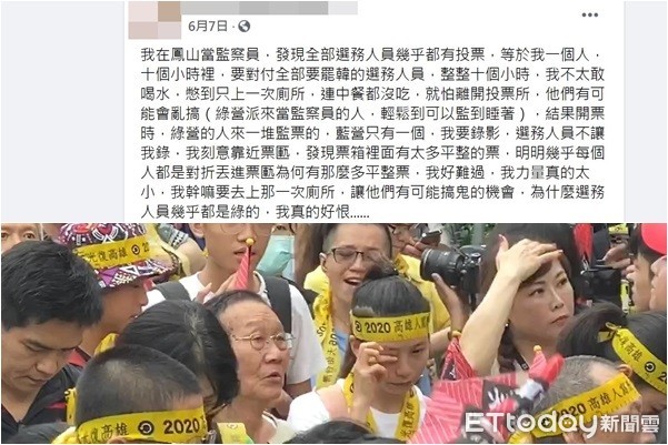 罷韓投票6月6日下午4點許結果出爐,韓國瑜遭罷免確定後,一名呂姓女子當晚6時許透過手機在臉書發文,指稱自己在鳳山當監察員時,發現發現全部選務人員幾乎都有投票,「等於我一個人,十個小時裡,要對付全部要罷韓的選務人員,整整十個小時,我不太敢喝水,憋到只上一次廁所。」