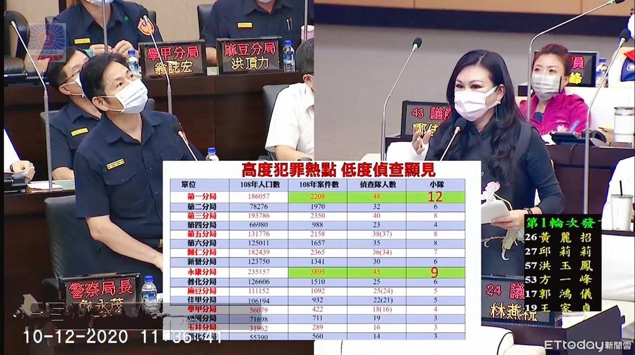 ▲台南市議員林燕祝瓔求台南市警局長詹永茂,將各分局交通分隊、偵察隊人力補好補滿,以免車禍認定標準不一、辦案人力不足影響治安。(圖/記者林悅翻攝,下同)
