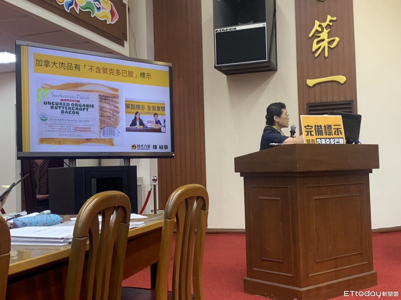 陳椒樺上台後,先稱讚陳時中在新冠肺炎防治作為上,是一位負責的部長,「但不能到這裡就轉彎」,要求明年起應標示肉品萊克多巴胺殘留量,如果無法執行,也要比照基改食品的進行敏感含過敏原食品標示,更舉肉品全標示「不含萊克多巴胺」案例,呼籲台灣也該比照辦理,或者列出是否有動物用藥殘留。