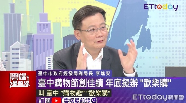 2020臺中購物節交出亮眼成績,不僅總消費登錄金額衝破90億元,線上總瀏覽量也突破8億;另有媒體調查六都振興加碼網路討論聲量,臺中更以42.73%領先其他五都。對此,臺中市政府經發局副局長李逸安15日在ETtoday《雲端最前線》節目中預告,年底還有耶誕節、跨年,及農曆過年的年貨大街等,市府正規劃整合、續辦「歡樂購」活動;至於明年購物節目標是否突破百億?李逸安笑稱「這是我們的期待跟想法」,應該沒問題。