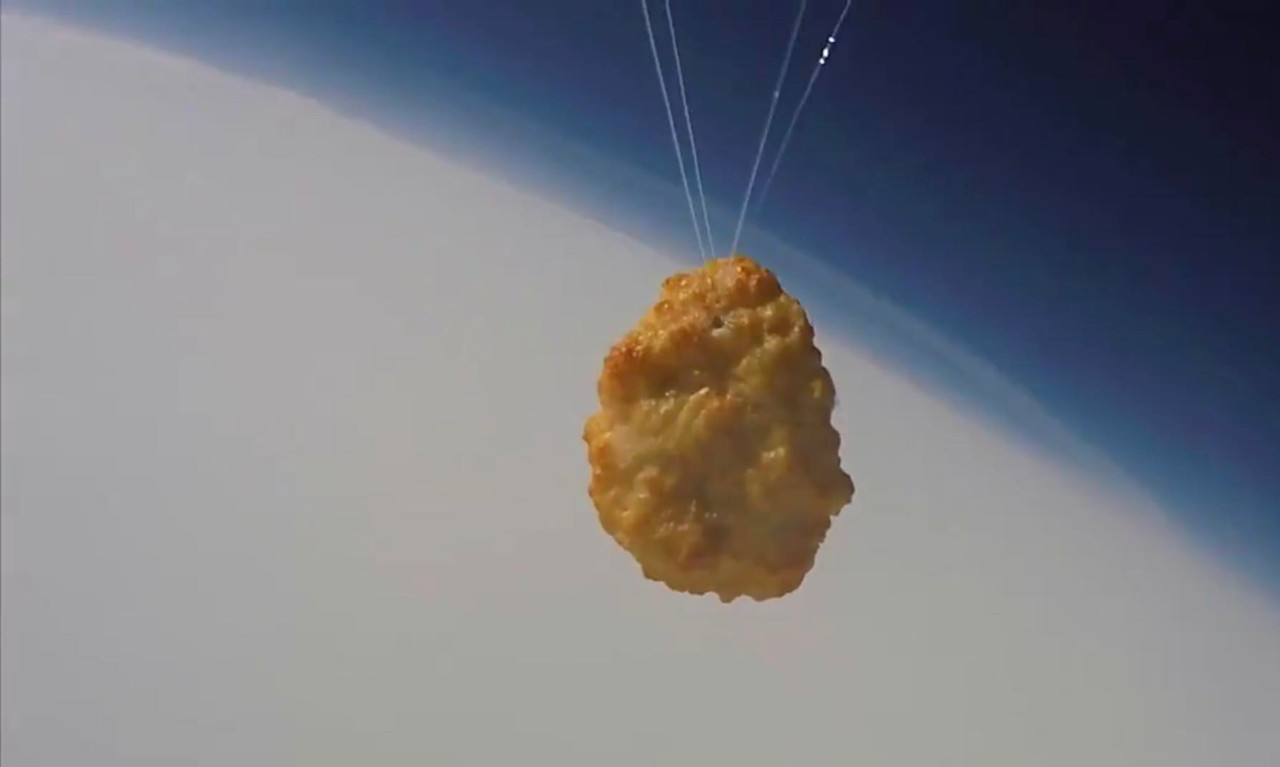 隨後氣球以每小時200英里(約322公里)的速度返回地球,降落傘在大約1萬9000公尺的高度展開,以確保雞塊安全著陸。雖然高度尚未達真正外太空的高度,但把炸物送上天的作法已經引起熱烈的討論。