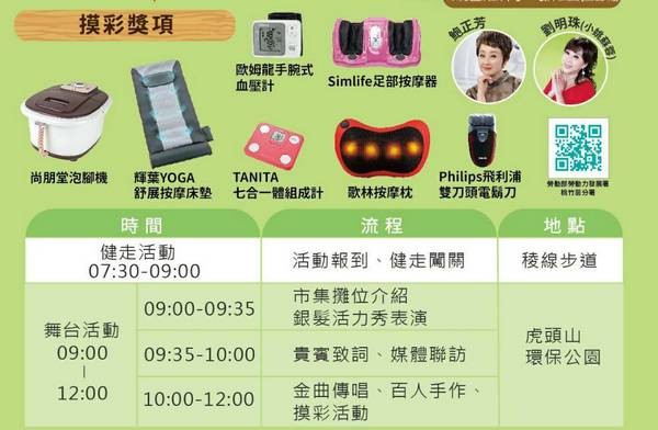 免費參加還送好康!勞動部勞動力發展署桃竹苗分署為展現中高齡活躍及充沛就業力,於10月24日在桃園虎頭山環保公園舉辦「銀力時代 再創高峰」千人健走活動。整個活動免費參加,除準備了1,000份「鋁合金避震登山杖」完賽禮、2,500份「摺疊後背包」參加禮,還有按摩舒壓床墊、泡腳機、血壓計、按摩枕等多項摸彩好禮,讓你帶回家。
