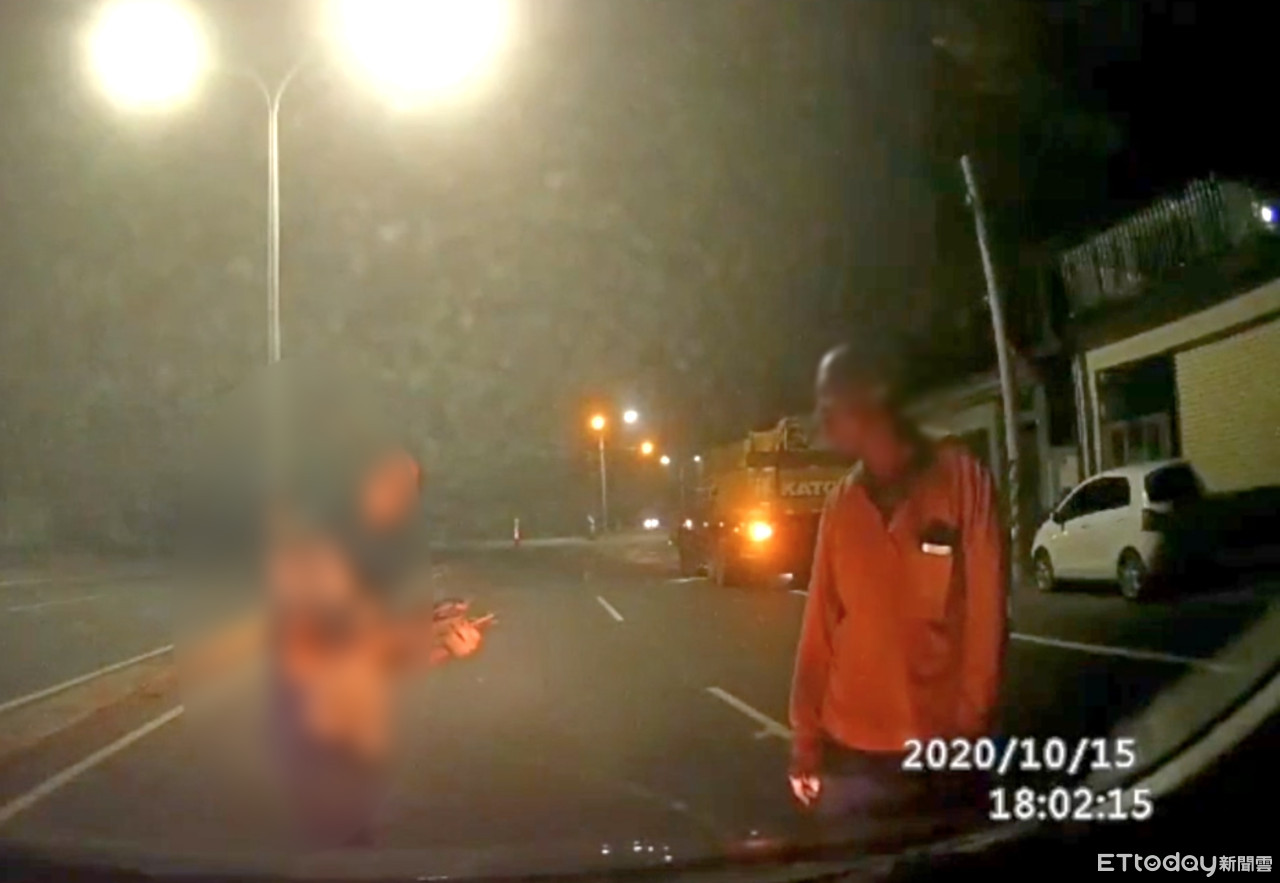 ▲嚇壞的女駕駛緊急煞車,並下車告訴吊車駕駛「嚇到我了」,孰料,吊車司機(右)聽到竟回「不然我幫你收驚」。(圖/記者蔡佩旻翻攝)