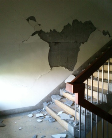▲327地震讓朝陽科大的教室牆壁龜裂。(圖/取自朝陽科技大學粉絲團)
