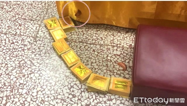 ▲信徒擲筊,筊竟黏在神桌桌布上,廟方特地用金紙圍住保留神蹟。(圖/記者游芳男翻攝)