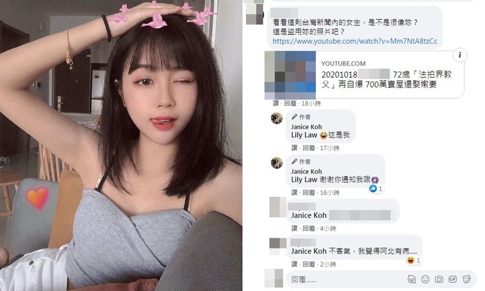而阿伯提供的網紅示意圖,其實是馬來西亞網紅Janice Koh,這位大馬正妹光是臉書就有15萬人追蹤,IG更是有29.6萬位追蹤者。Janice Koh看到有人留言給她「看看這則台灣新聞內的女生,是不是很像妳?這是盜用妳的照片吧?」忍不住貼出笑到噴淚的表情符號,承認照片中的女子就是她「這是我」。不過對於被盜圖,她不僅沒有生氣,還高EQ的感謝通知的女網友「謝謝你通知我哦!」