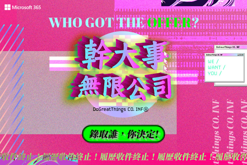 幹大事無限公司甫上線就接連PO出超貼近Z世代心聲的貼文,表示公司正在尋找擁有「能夠突破傳統職場框架的挑戰者」、「能夠運用新世代電腦幹大事的工作者」、「能在可愛與效率間雙棲的微軟寶貝」 三種特質的夥伴,不僅吸引跨領域的各路好手應徵,小編更因為履歷如雪片般飛來,忍不住對有興趣的求職者先偷偷洩題。要適應數位化浪潮、並穩穩站在浪尖,擁有更彈性的工作型態是必然,如果你懂得使用Word跟Excel合併列印、藉PowerPoint設計構想、擅長Teams雲端協作、善用Outlook行事曆做時間管理,那錄取通知書就快到手!新世代Gen-Z與傳統職場中的資深前輩,到底誰更有勝算能贏得幹大事無限公司的青睞?Gen-Z們表示,職場問題百百種,不過只要擁有Windows 10跟Microsoft 365的雲端儲存、移動跨平台、遠端視訊團隊協作等特性,就能讓自己不再被工作綁死,隨時隨地都Online,同時又能保有私人生活,這種平衡才是Z世代追求的人生。