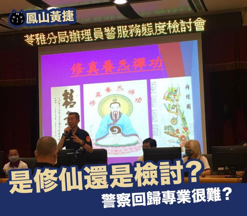 高雄市議員黃捷接獲民眾爆料,苓雅分局舉辦聯合勤教期間,分局長居然大力宣揚宗教,邀請大家一起修仙做法跳體操,直呼把基層員警當作仙劍奇俠傳真人版實在離譜。對此,高市警局澄清指出,這是氣功講座。