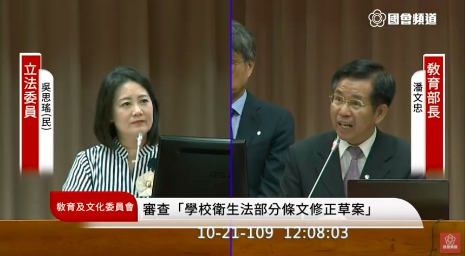 最後吳思瑤提自己版本「學校飲食專法」,去全面解決問題,並問潘文忠是否夠精準、夠全面?潘文忠回應,學校衛生法是進步跟前瞻法規,部分校園供膳上,都朝向以提供國內優良食材給食農教育基礎,對於專門校園飲食法規,教育部也是朝這方向做準備。