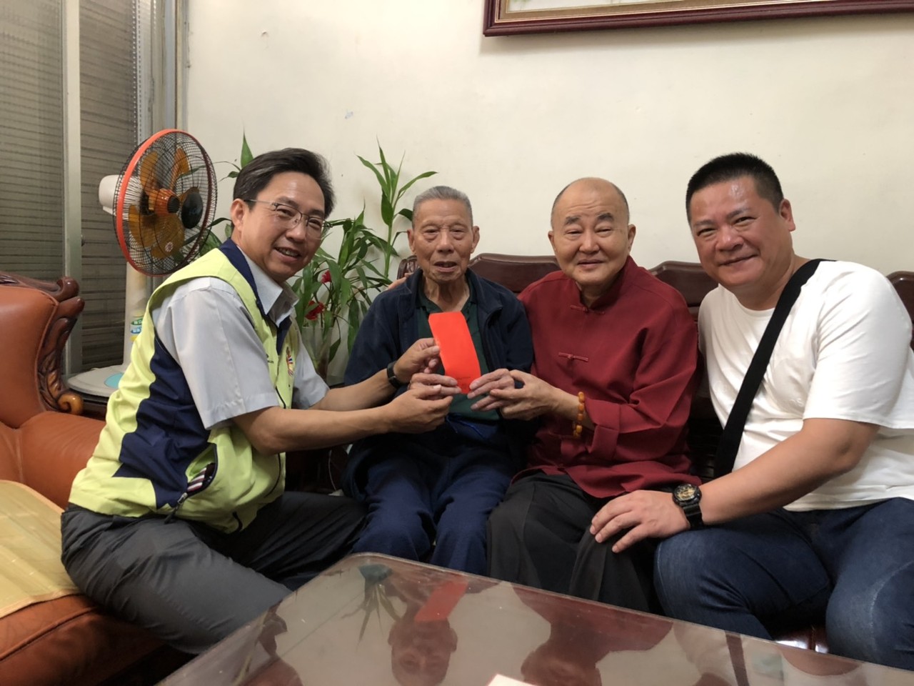 25日即是九九重陽節,中華佛教善緣慈善會長張騰龍及顧問姚富強,為感念一生保家衛國的老榮民,21日到台中市榮民服務處致贈149名百歲以上榮民眷、每人1千元的重陽禮金,由處長關永忠代為接受,3人並前往訪視百歲榮民楊盛詮,表達關懷之意。