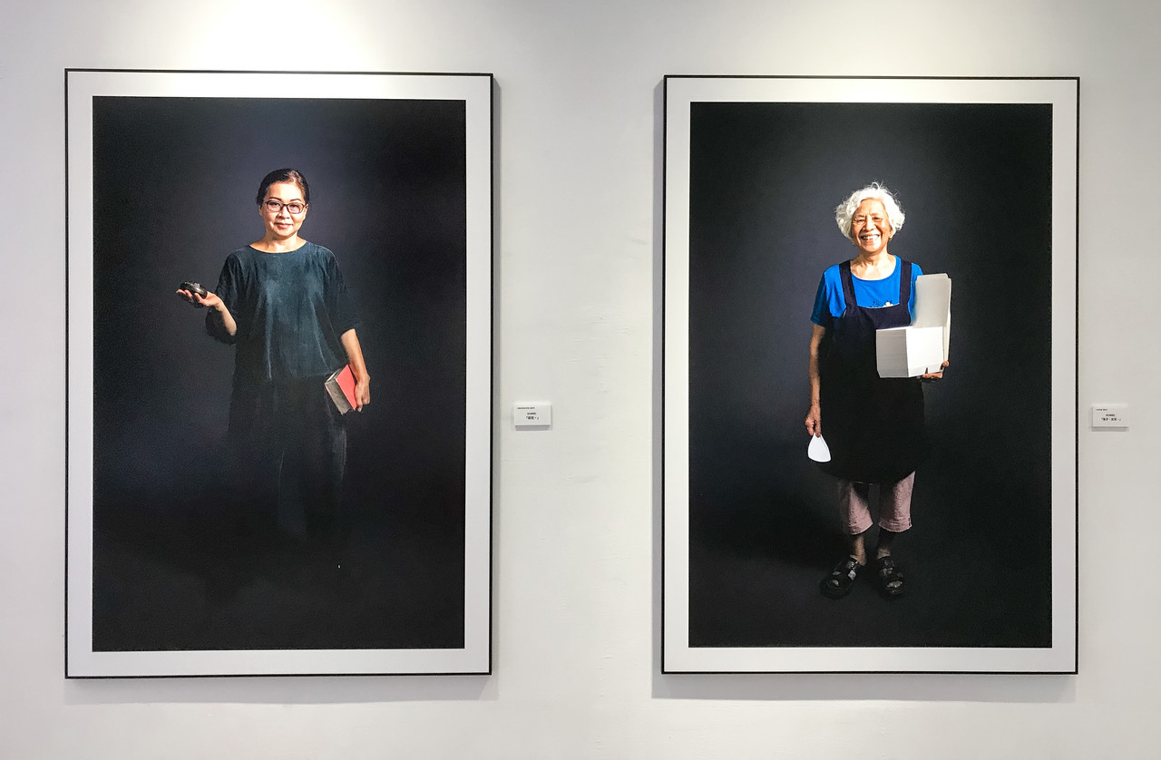 ▲市場頭家們拿著各自的生財/生存道具,全身肖像展現滿滿職人魂,左為元道命相風水學會、右為口味快餐。