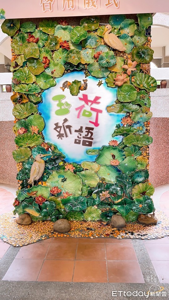 大同國小師生以百年校史中,最令校友懷念的校園景觀~松鶴池為舞台,展現林玉山大師「蓮池」的另類精彩,歷經半年創作而成的「玉荷新語」交趾陶裝置藝術,日前該校禮運樓大門玄關舉行啟用儀式。