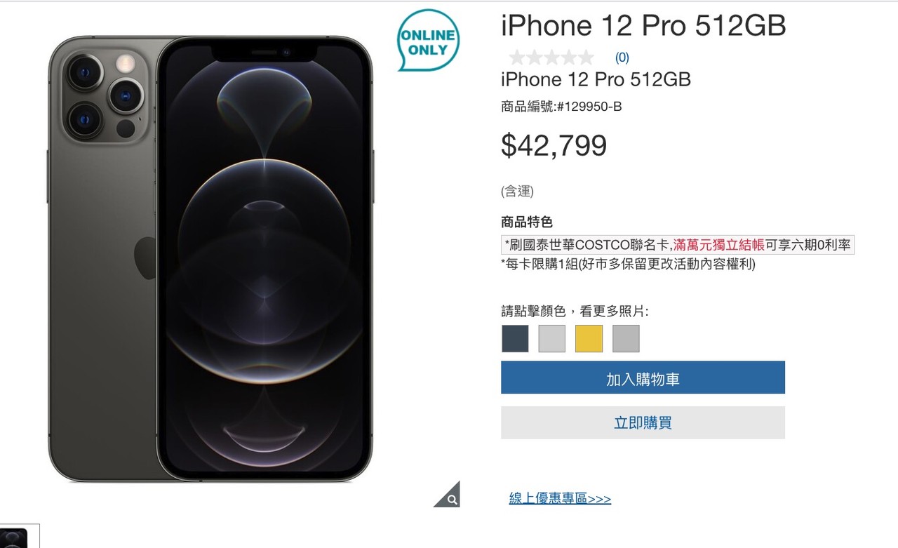 實際上好市多官網查詢,iPhone12 128GB售價27495元、iPhone12 256GB售價30899元、iPhone12 Pro 512GB售價42799元。比起蘋果官網售價還便宜,分別激省了1005元、1101元、1601元。