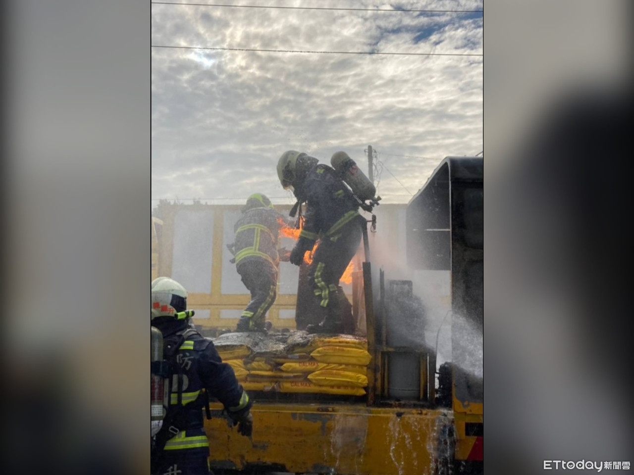 ▲2勇消全副武裝上工務車,將冒火的瓦斯桶搬下。(圖/記者李忠憲翻攝)
