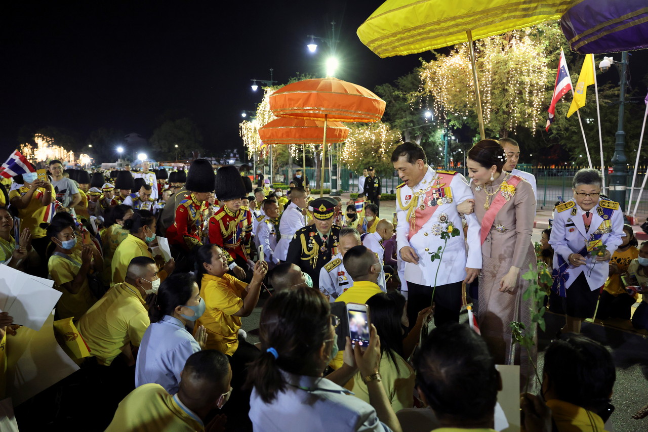 ▲泰王夫婦開心地向人群致意,心情似乎絲毫不受前幾日學運影響而陷入陰霾。(圖/路透)