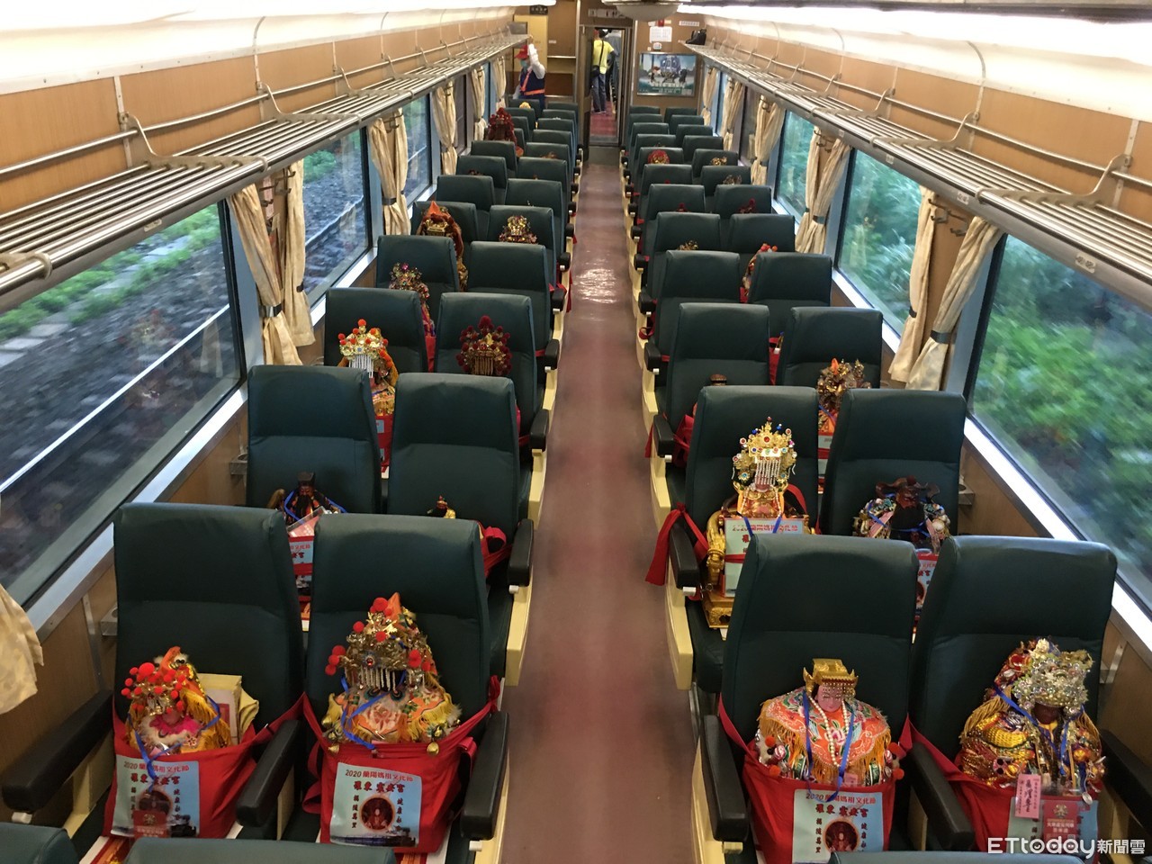 本班蒸汽列車在24日上午8點10分從蘇澳站發車開往頭城,其中第3節及第4節車廂座位上滿座各宮廟的神尊,共有88尊神尊搭乘火車巡安,每尊神尊還繫上專屬的安全帶,場面難得一見,相當壯觀。