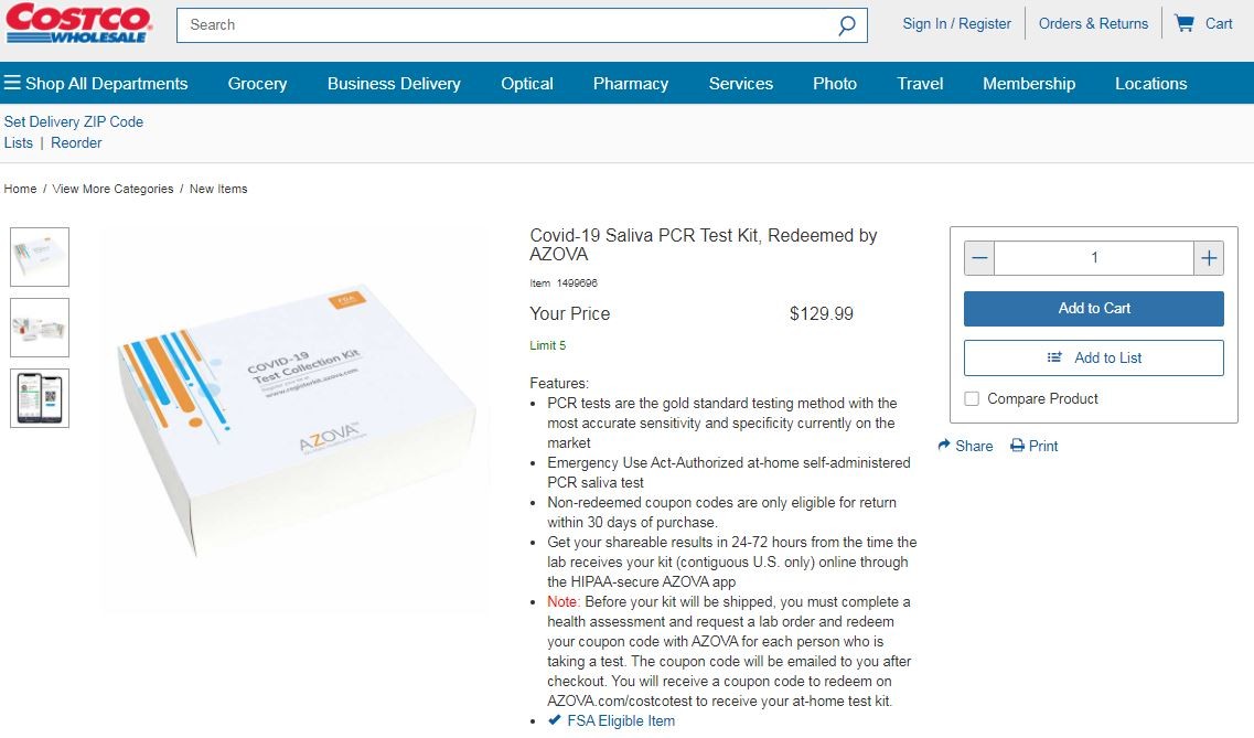 美國好市多(Costco)於網購平台推出「新冠病毒(COVID-19)篩檢盒」,讓民眾能夠自行在家收集唾液,藉由遠程醫療平台AZOVA進行管理,在試劑回到實驗室後的1至3天就能得到結果。