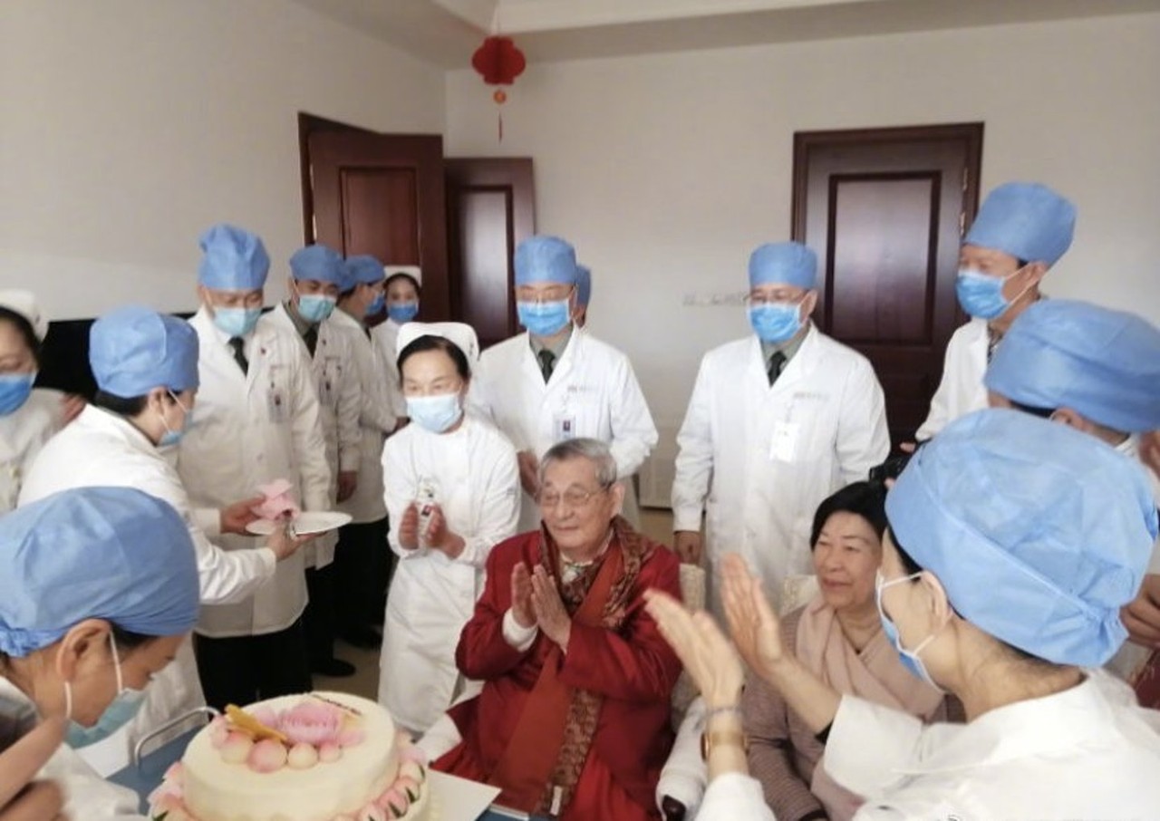 ▲網絡流傳醫護人員為朱鎔基慶祝生日的畫面。(翻攝自抹雲樓主微博)