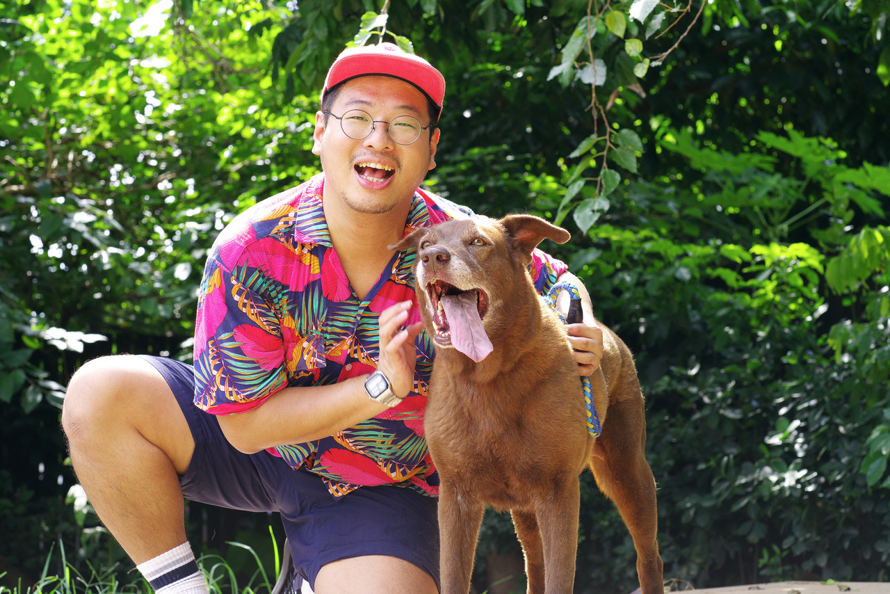 梁鈺杰指出,還有隻「大雄」,肉壯體型比較像胖虎啊,是個大塊頭黑狗兄,個性超級溫和、親人,有次暫離一下去拿肉肉,就像個小孩叫媽媽一樣帶著熱切的眼神呼喚他,拿濕紙巾擦身體幫他降溫時,意外發現喜歡被摸屁屁,摸到舒服還會打甩尾巴扭屁股,愛笑的大雄,遇到鏡頭就會男模笑,實在專業。