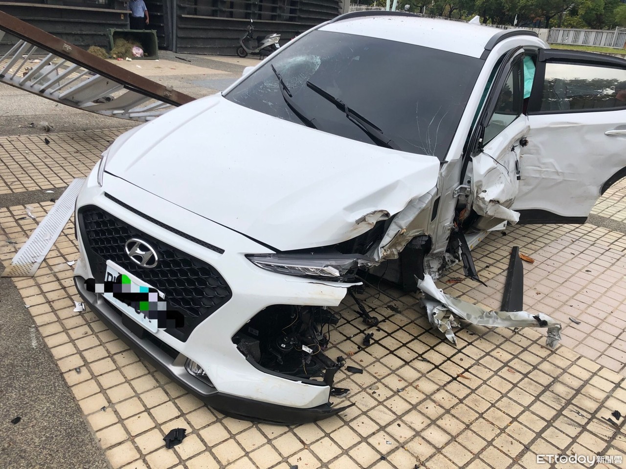 據悉,鄭男駕駛的車輛是向友人借的,且該車友人今年才購入,未料鄭男今天載著2名友人返家時竟發生意外,直接衝撞文心森林公園內的鐵柵門,衝擊力道強烈,鐵門因此凹陷倒塌,而才剛買的新車同樣受創嚴重,車頭毀損、左前輪胎噴飛,左側車身也有多處傷痕。