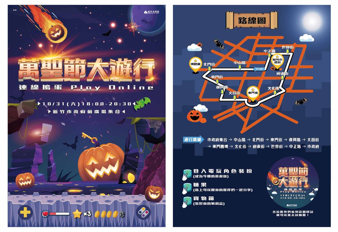 孩子最期待的萬聖節大遊行來了!新竹市政府表示,萬聖節大遊行將於本周六10月31號晚上6點展開,今年以「連線搗蛋Play Online」為主題,邀請大小朋友變身「電玩角色」上街闖關搗蛋。新竹市政府表示,遊行三大亮點包括:路線從市府廣場出發繞行舊城區、東門圓環、護城河,途中將有六大街頭表演,包括發亮的LED高蹺機器人、夜光武士,更有FOCA高空樹表演,在夜晚給孩子驚喜;新竹市長林智堅也將變身經典電玩角色,陪大家一起搗蛋,敬請期待!