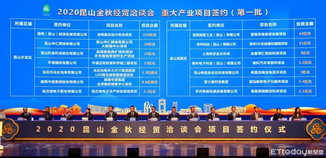 江蘇昆山今(26)日舉行2020金秋經貿洽談會,主打疫情趨緩後的Q4經濟,包括光電、半導體、生物醫藥、高端裝備製造等71個項目簽約,總投資額達933.58億元人民幣(約4千億新台幣)。此外,洽談會也表揚今年產值超50億元人民幣(約200億元新台幣)的10間企業,台企仁寶、緯創、富士康、南亞及世碩電子皆入榜。