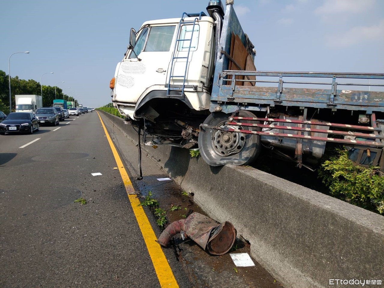▲國道1號北向311.4公里台南安定段處,下午發生聯結車因踩煞車操作不當失,撞擊內側護欄護欄卡在中央分隔帶,影響南北雙向內線車道行車。(圖/記者林悅翻攝,下同)