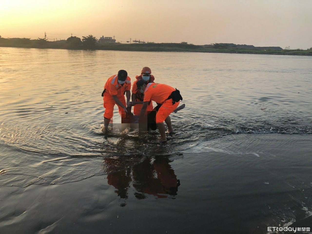 ▲海巡第11岸巡隊彌陀安檢所值班人員,據報協助高市警岡山分局在阿公店溪近出海口處將男子遺體搬運上岸,交高市檢警相驗查處。(圖/記者林悅翻攝,下同)