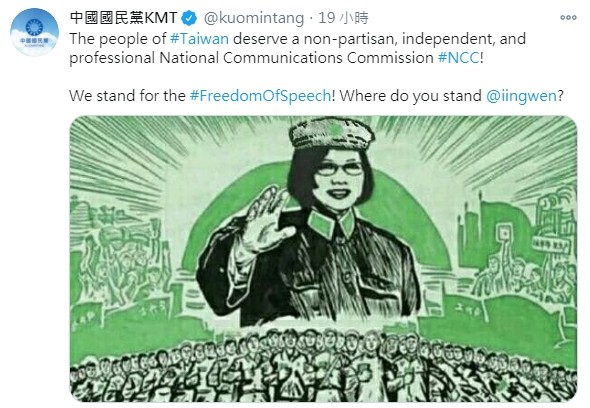 由於近日中天換照事件,國民黨多次批評蔡政府介入國家通訊傳播委員會(NCC)。在27日下午,國民黨在官方推特上傳一張把蔡英文的臉,合成在毛澤東身上的綠色圖片,並用英文寫道,「人民值得一個無黨派、獨立與專業的NCC,我們站在言論自由的一方,蔡英文妳站在哪邊?」