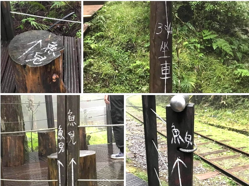 ▲太平山茂興步道木柱椅子等慘遭亂塗鴨,網找凶手要追「魚兒」。(圖/擷取自《臉書太平山國家森林遊樂區粉專》,下同)