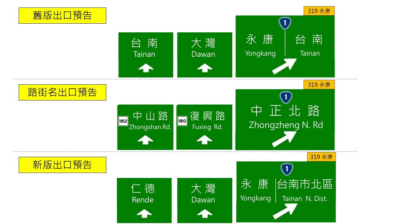 高公局指出,國1銜接台南都會區永康、大灣及台南之3處交流道出口預告標誌內容,原本即有行政區名、路街名(裕農路)及舊台南市名,出口門架標誌又有同時標示「台南」右出及直行之情形,有用路人反映容易產生混淆,故規劃將永康、大灣及台南交流道出口改標示為中正北路、復興路及中山路。
