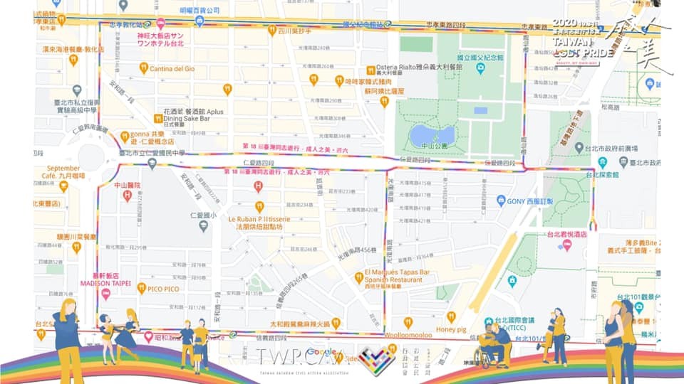 ▲應援同志遊行,Google地圖出現「彩虹路線」!(圖/翻攝自臉書「臺灣同志遊行 Taiwan LGBT Pride」)