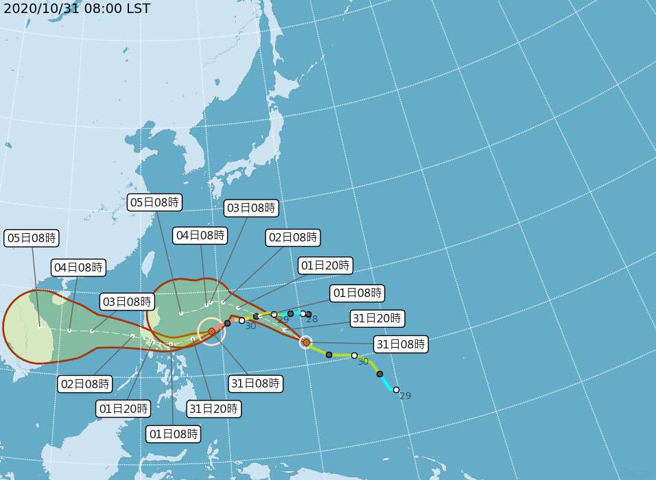 而位在天鵝颱風東南方的閃電颱風發展就未如天鵝般順遂,其環流雲系遲遲未能整合完全,生成兩日後仍停留在輕颱下限強度,預期未來3-4日逐漸接近呂宋島東方海面過程仍有發展增強機會,路徑則仍有較大不確定性,預估西進通過呂宋島機會較高。