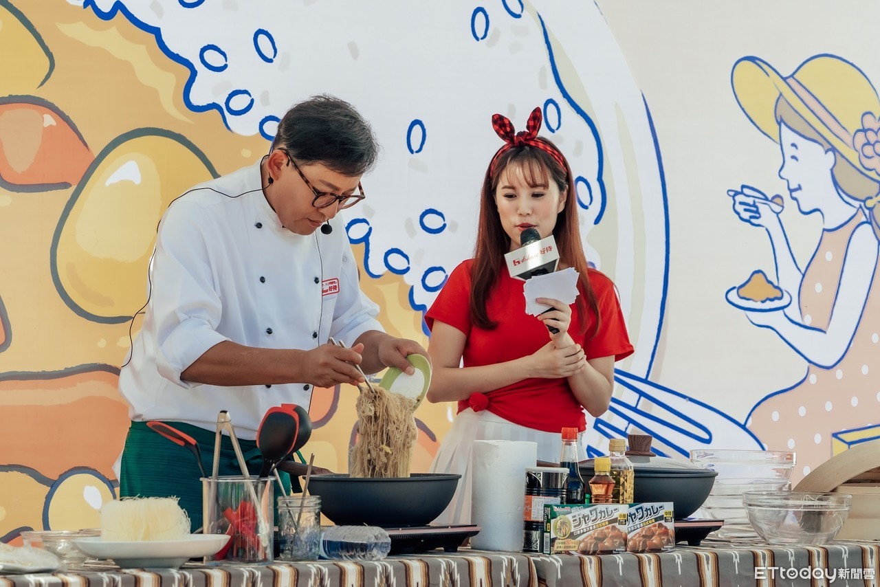 ▲名廚詹姆士親自烹調獨創食譜料理「爪哇咖哩炒米粉」,舞台區瀰漫濃濃咖哩與米粉香氣。(圖/業者提供)